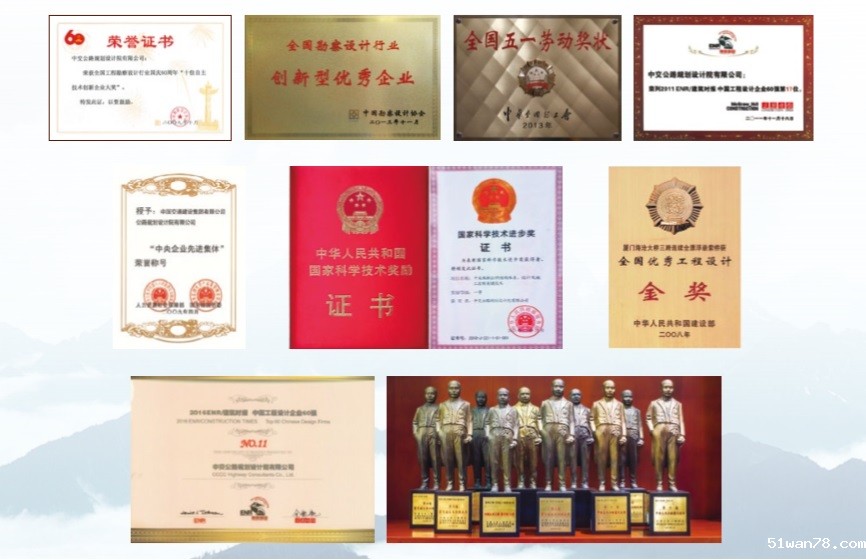 六十年来 , 公司在公路桥梁勘察设计、标准规范、定额编制、技术咨询领域荣获国家级和省部级奖项多达 300 多项 , 其中有“国家科学技术进步奖”、“全国优秀工程设计奖”、“中国土木工程詹天佑大奖”、“国家优质工程奖”、“中国建筑工程鲁班奖”等。国际桥梁大会 (IBC) 颁发的“乔治·理查德森奖”、“尤金·菲戈奖”、“古斯塔夫·林德萨尔”等更让公司走向了世界。公司坚持创新,获得“全国勘察设计行业创新型优秀企业”、“全国建筑业技术创新先进企业”、全国工程勘察设计行业国庆 60周年“十佳自主技术创新企业大奖”等,获得“中国交通建设十大桥梁英雄团队”、“国家科技计划执行优秀团队奖”、“中央企业先进集体”等殊荣 , 获得中华全国总工会颁发“全国五一劳动奖状”,被授予全国文明单位、首都文明单位等荣誉称号。